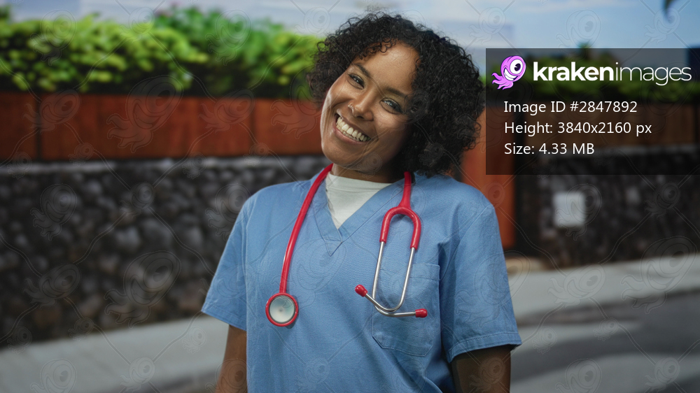 Woman doctor smiling with red stethoscope on sunny street outside residential building entrance; compassion.