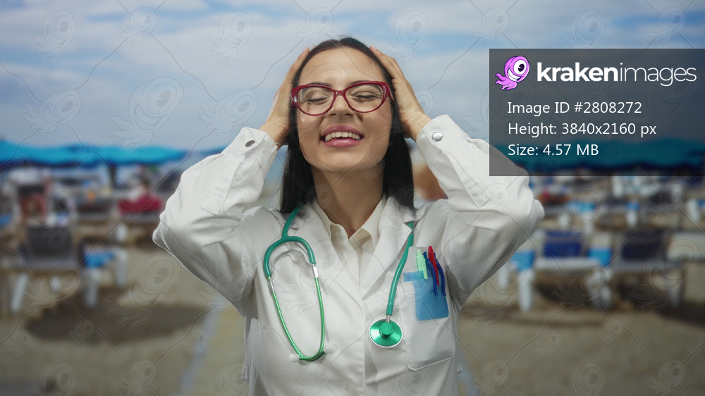 Woman doctor smiling with stethoscope on beach surrounded by seaside chairs under sunny blue sky, wearing medical uniform and vibrant glasses.