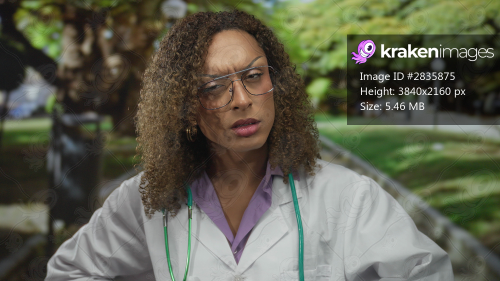 Woman doctor squints and adjusts green stethoscope in leafy park outdoors while pondering case; contemplation.