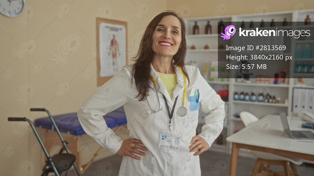 Woman doctor standing confidently in a clinic with stethoscope and medical attire conveying professionalism in a hospital workspace.