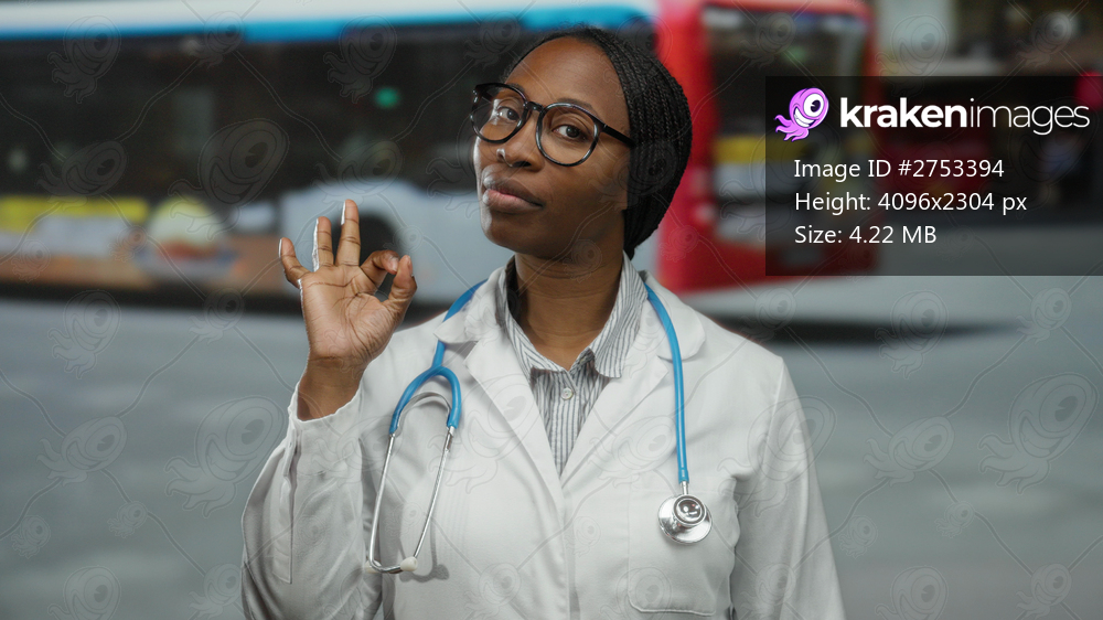 Woman doctor standing outdoors in urban city street making okay gesture with stethoscope around neck wearing white coat and glasses smiling confidently at camera - Kraken Images