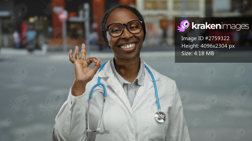 Woman doctor standing outdoors in urban city street making okay gesture with stethoscope around neck wearing white coat and glasses smiling confidently at camera - Kraken Images