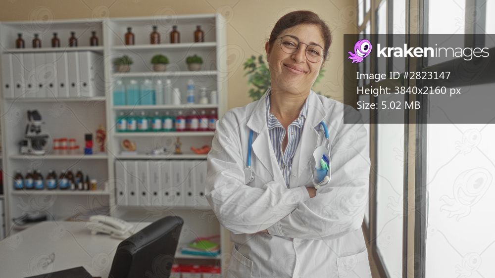Woman doctor stands by window arms crossed with stethoscope in bright clinic filled with medicine bottles and binders; calm assurance.
