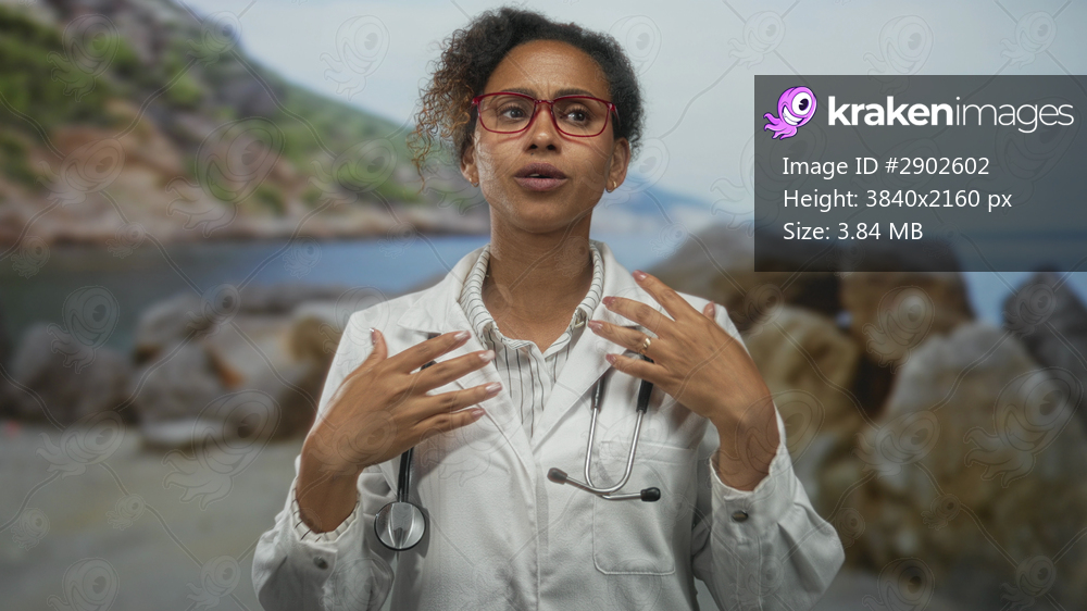 Woman doctor with stethoscope adjusting collar and touching chest in studio; compassion care guidance.