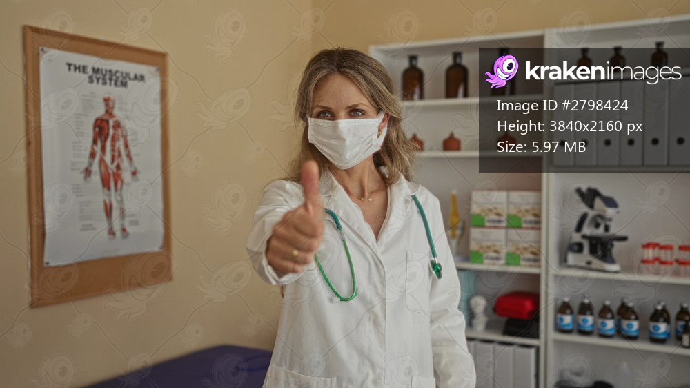 Woman doctor with stethoscope adjusts mask in a clinical office with medical equipment and anatomical posters.