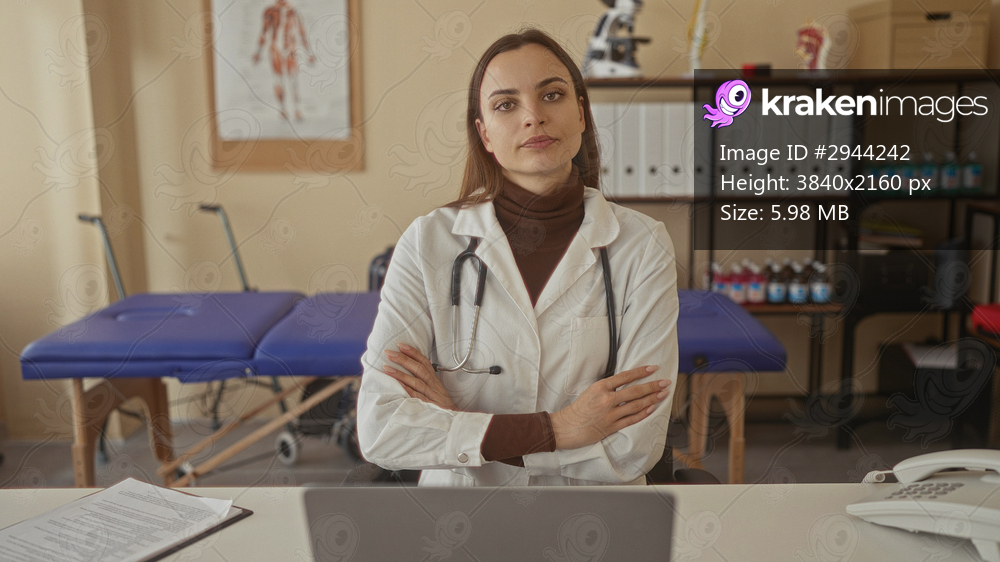 Woman doctor with stethoscope, arms crossed at desk in clinic building at laptop; professional frustration.