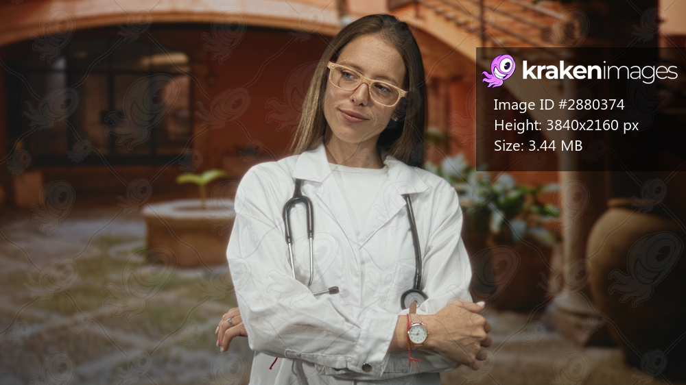 Woman doctor with stethoscope at building entrance, wearing white coat, arms crossed in front of home courtyard; care professionalism confidence.