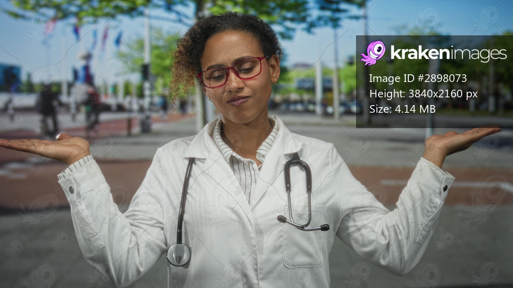 Woman doctor with stethoscope and bare hands raised palms up on busy city street; uncertainty medical decision.