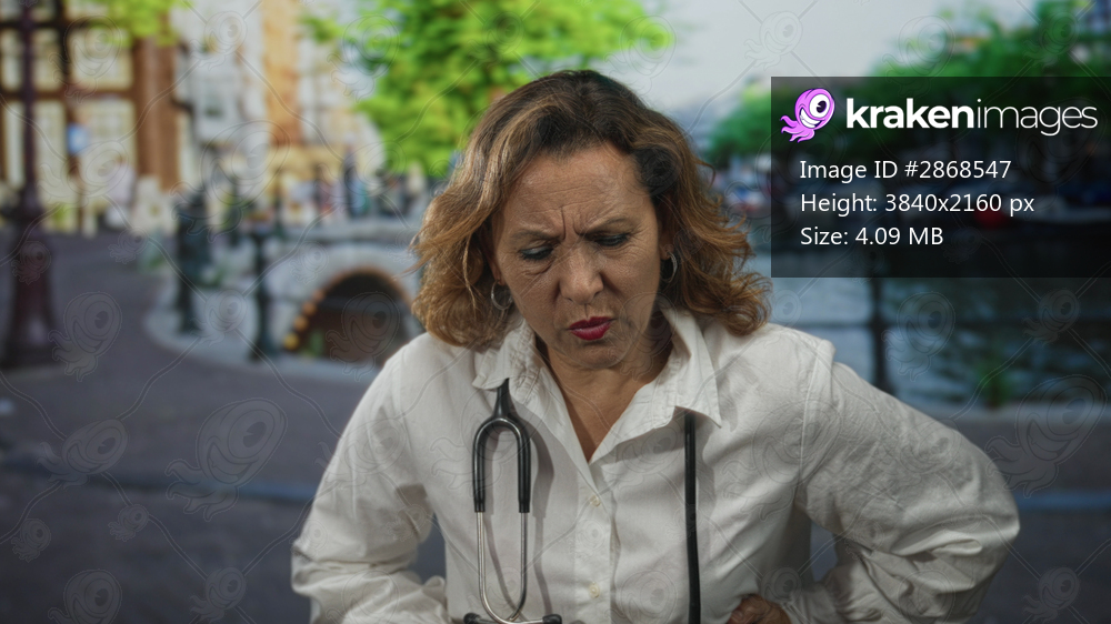 Woman doctor with stethoscope clutching stomach on street by an amsterdam canal, holding side in visible pain; medical concern.