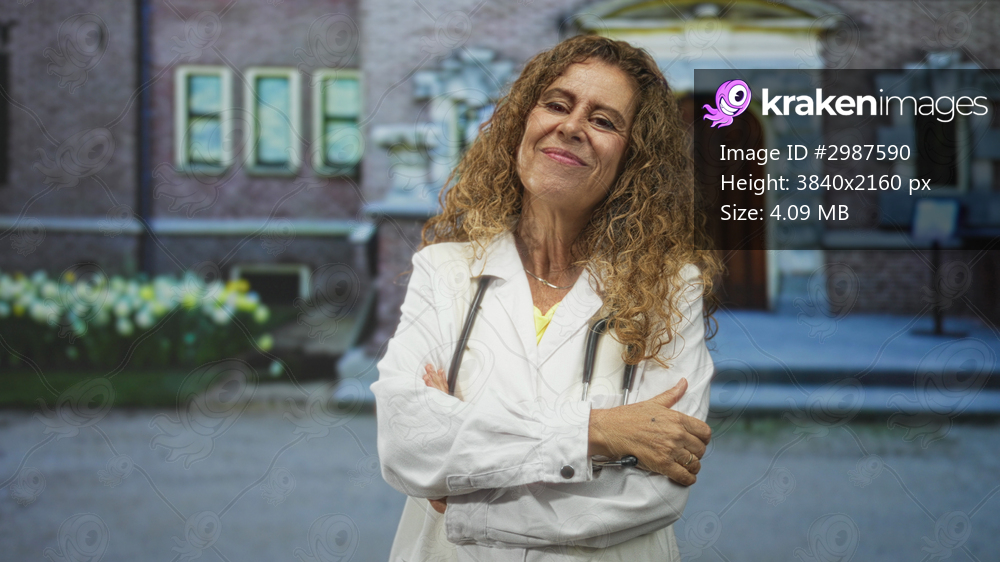 Woman doctor with stethoscope and crossed arms standing before a formal building entrance, smiling with relaxed posture; calm confidence.