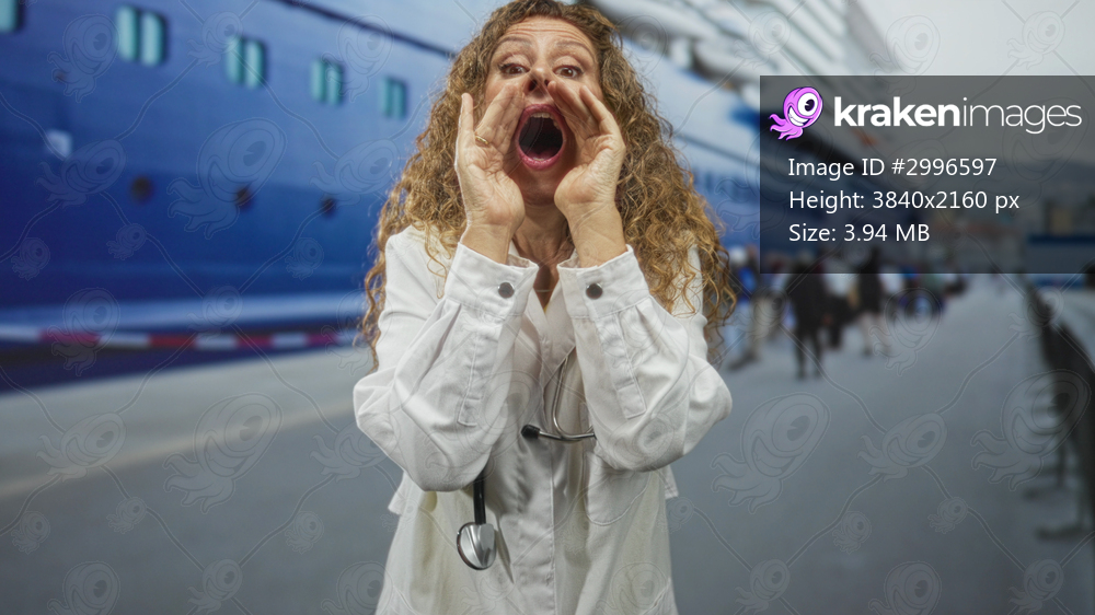 Woman doctor with stethoscope cupping hands to shout on dock street beside a large cruise ship; urgency.