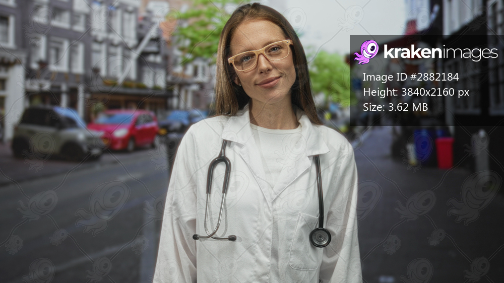 Woman doctor with stethoscope, eyes closed and slight smile on street in city; calm compassion quiet strength.