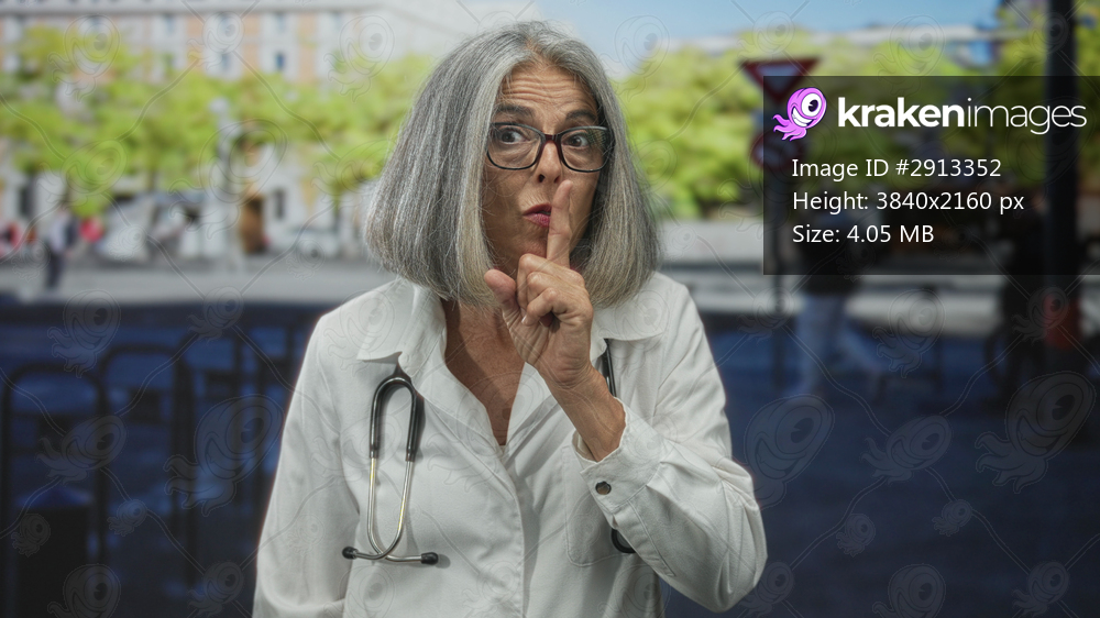 Woman doctor with stethoscope, finger to lips for silence on busy city street outdoors; serious hush.