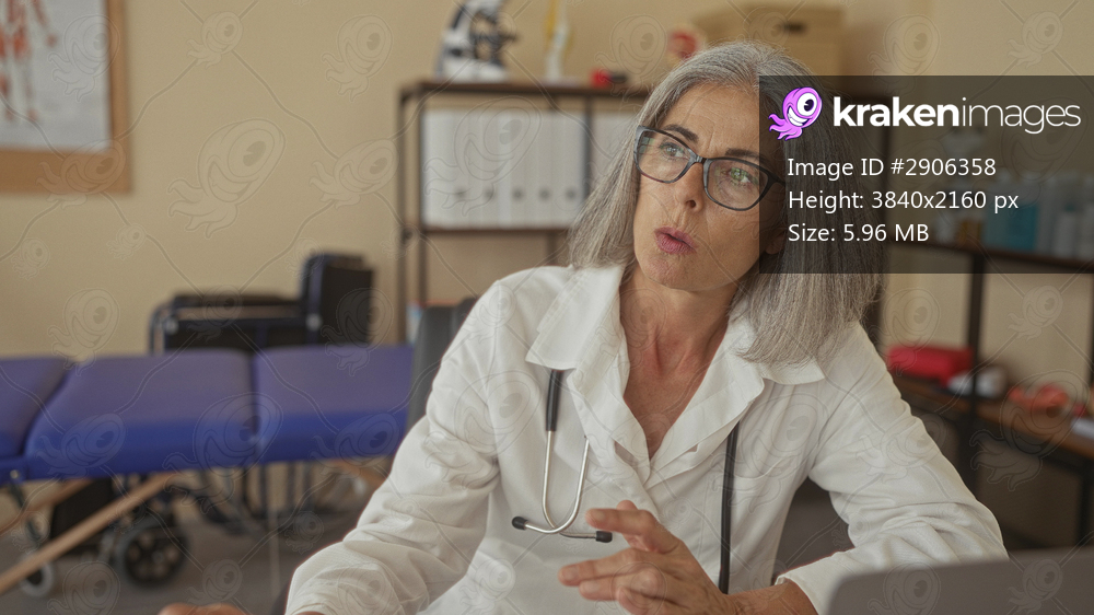 Woman doctor with stethoscope gesturing with hand and pointing pen in clinic office, grey haired middle age; patient care concern.