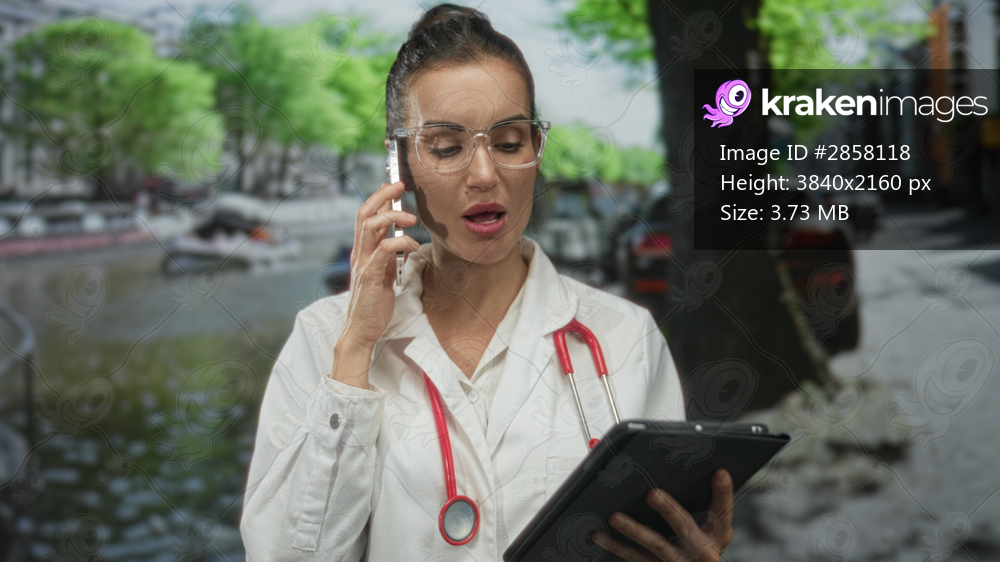 Woman doctor with stethoscope and glasses holds phone to ear while reading tablet on street by canal; professionalism.