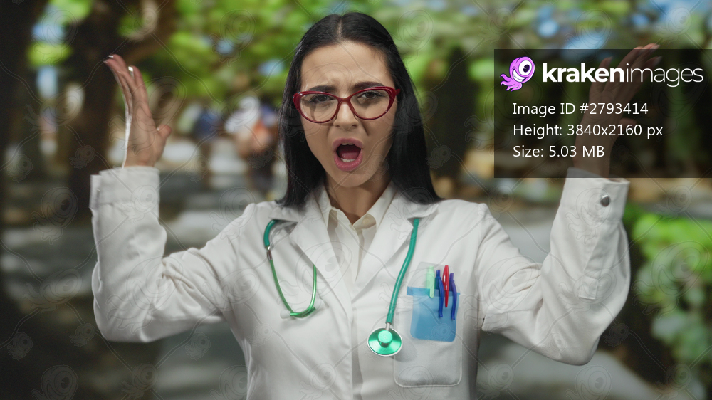 Woman doctor with stethoscope and glasses stands outdoors in a park surrounded by greenery engaged in an expressive discussion.