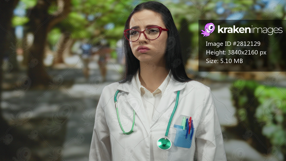 Woman doctor with stethoscope and glasses stands outdoors in a park surrounded by greenery engaged in an expressive discussion.