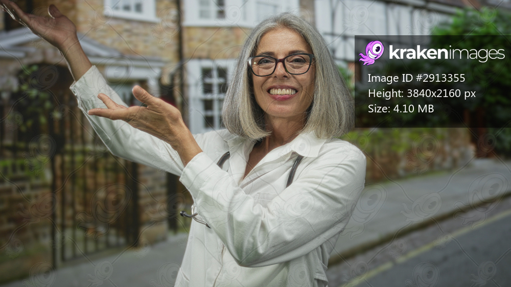 Woman doctor with stethoscope, grey hair and white coat, palms up gesture smiling on street by house entrance; community care compassion.