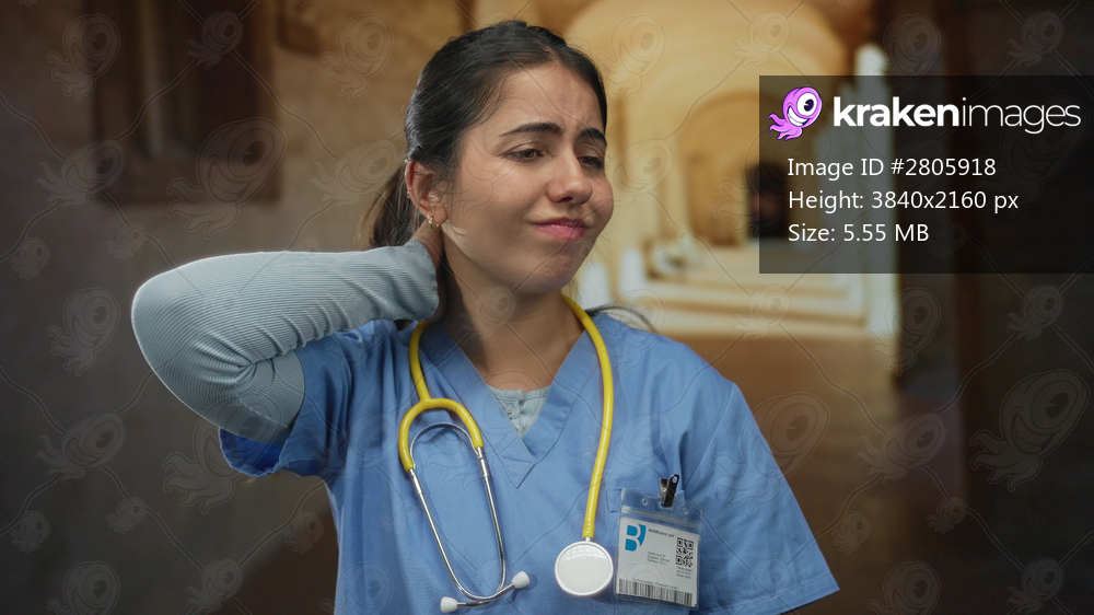 Woman doctor with stethoscope grips neck in pain gesture amidst historic old town building corridor; fatigue.