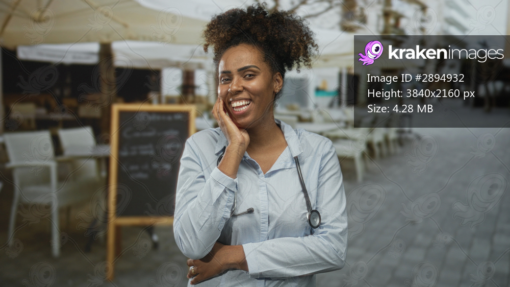 Woman doctor with stethoscope, hand on cheek and broad smile on a street terrace; confidence and care.