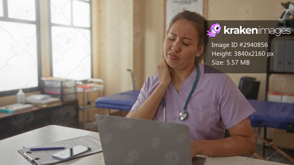 Woman doctor with stethoscope hand on neck seated at laptop reviewing paperwork in clinic building; fatigue stress.