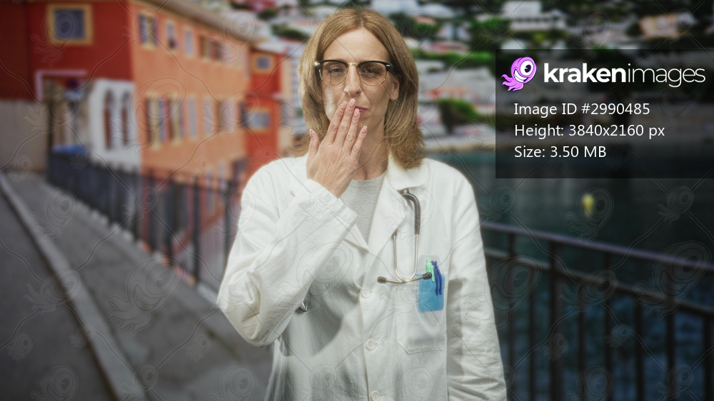 Woman doctor with stethoscope, hand to chest gesture by waterfront railing and colorful building; duty compassion.