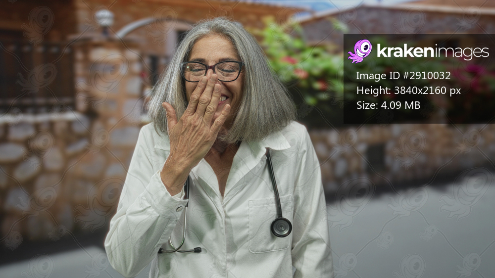 Woman doctor with stethoscope, hand to mouth laughing in front of a stone building entrance; compassion care trust.