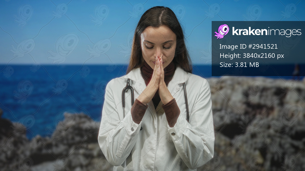 Woman doctor with stethoscope and hands in prayer gesture on coast near rocky shore; compassion healing serenity.