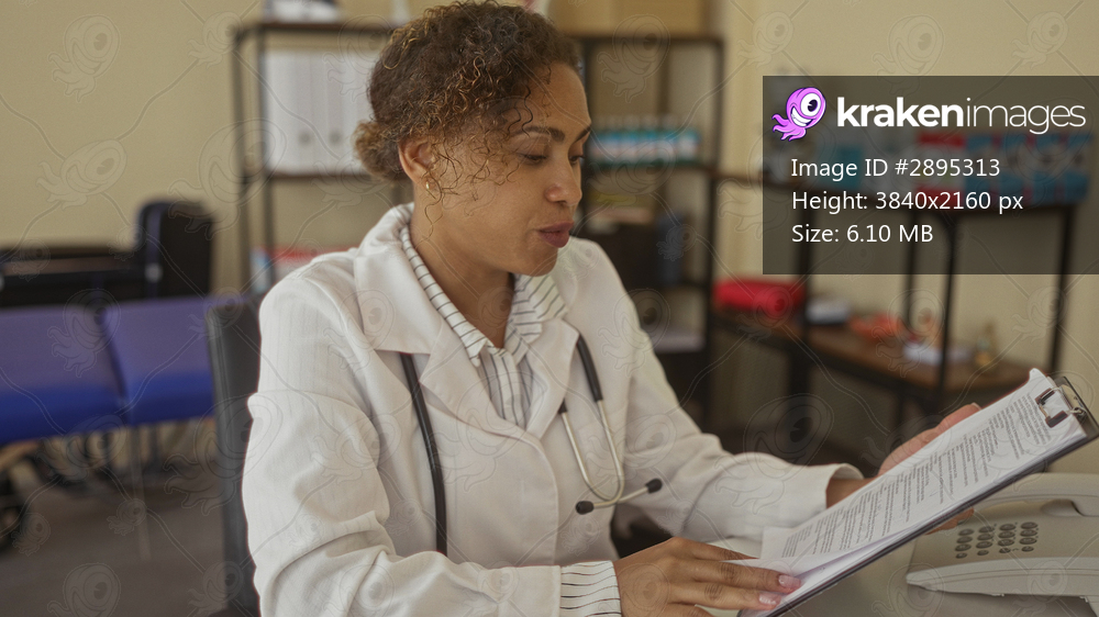 Woman doctor with stethoscope holding a clipboard and reading a patient form at a clinic desk, pointing at text with finger for review; compassionate care. - Kraken Images