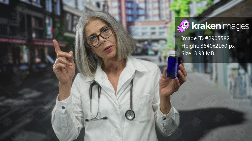 Woman doctor with stethoscope holding blue pill bottle and pointing finger on a street; medical advice calm.