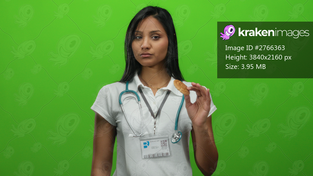 Woman doctor with stethoscope holding cookie in front of green wall, showcasing a thoughtful expression on an isolated background.