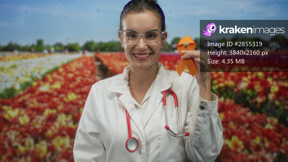 Woman doctor with stethoscope holding orange ribbon amid vibrant flower field in a forest; cancer support.