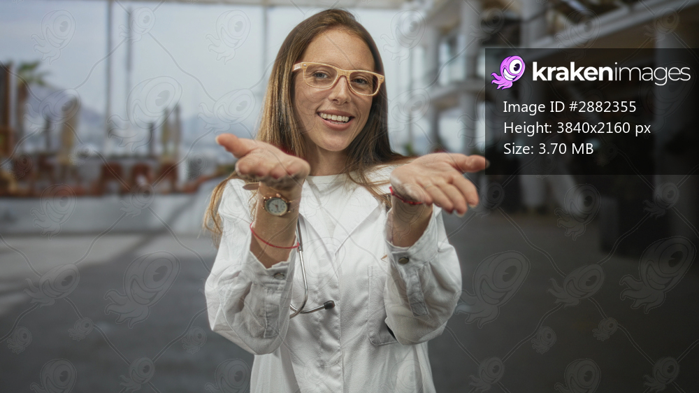 Woman doctor with stethoscope holding out hands palms up inside a building atrium entrance, smiling and offering help; compassion welcome care.