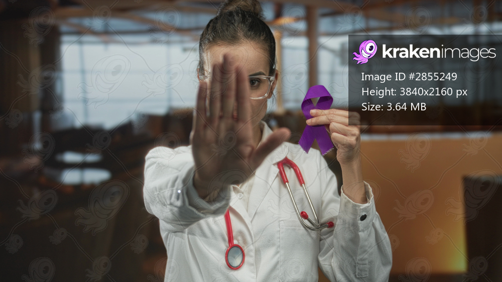 Woman doctor with stethoscope holding purple ribbon and palm forward stop gesture in building; solidarity determination.
