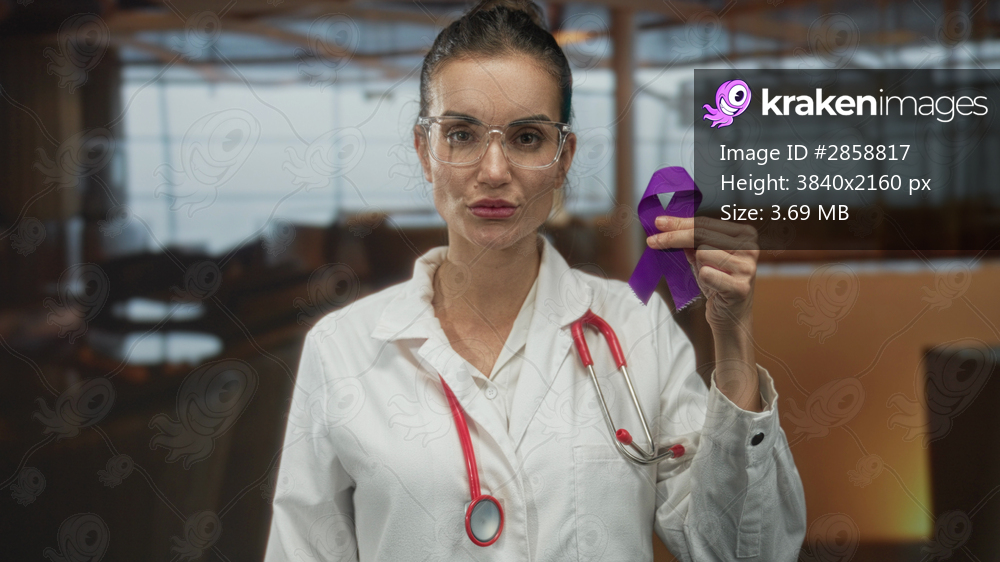 Woman doctor with stethoscope holding purple ribbon and palm forward stop gesture in building; solidarity determination.