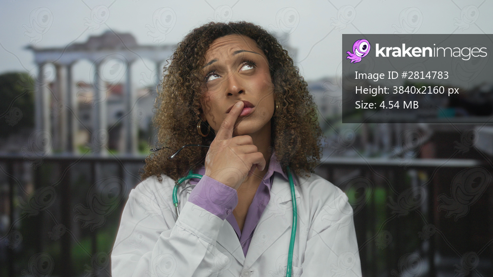 Woman doctor with stethoscope holds finger to lips in sunlit roman ruins building; contemplation reflection.