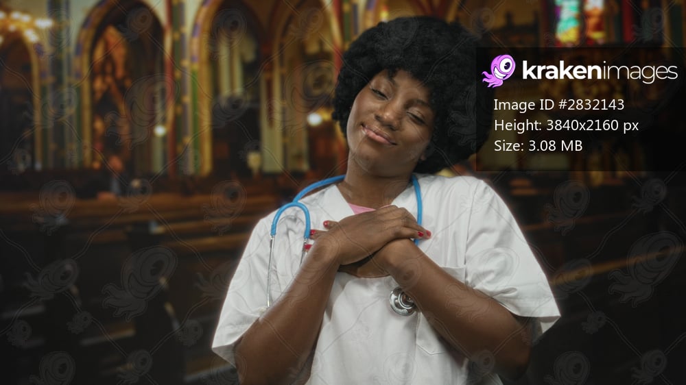Woman doctor with stethoscope holds hand to chest under stained glass windows in church building; faith gratitude.
