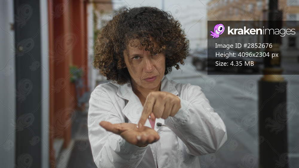 Woman doctor with stethoscope holds out palm and beckons with fingers for money on street; desperation plea.