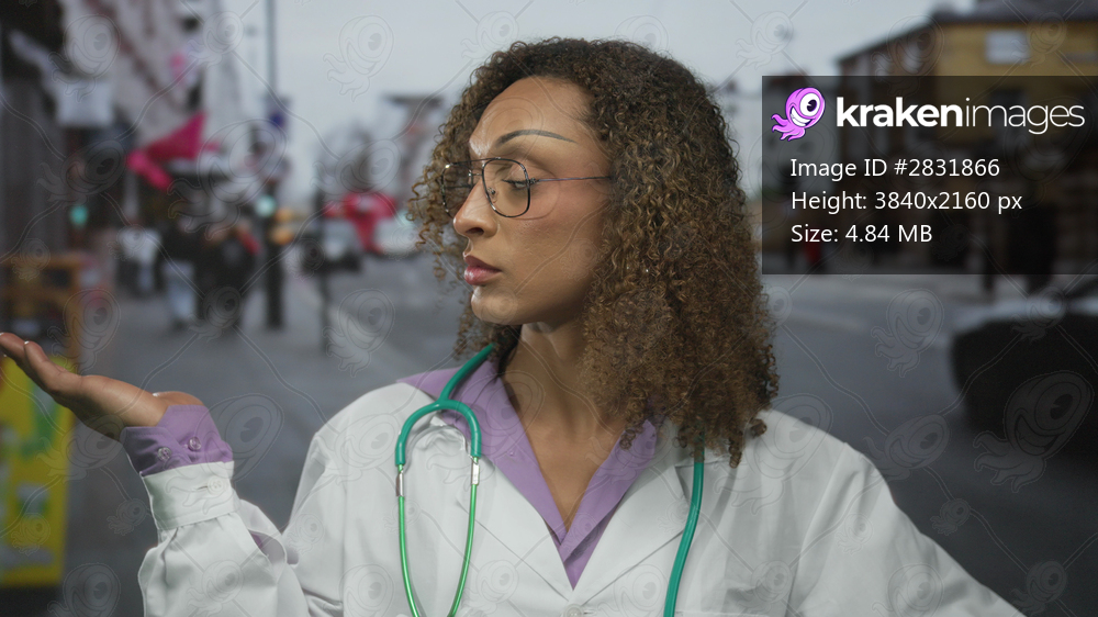 Woman doctor with stethoscope holds palm up and points finger while standing on a busy street; uncertainty hesitation.