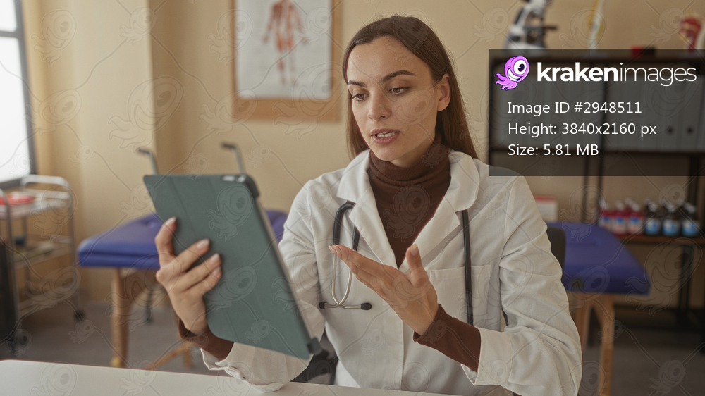 Woman doctor with stethoscope holds tablet and gestures in clinic building while speaking to patient on video; telemedicine reassurance.
