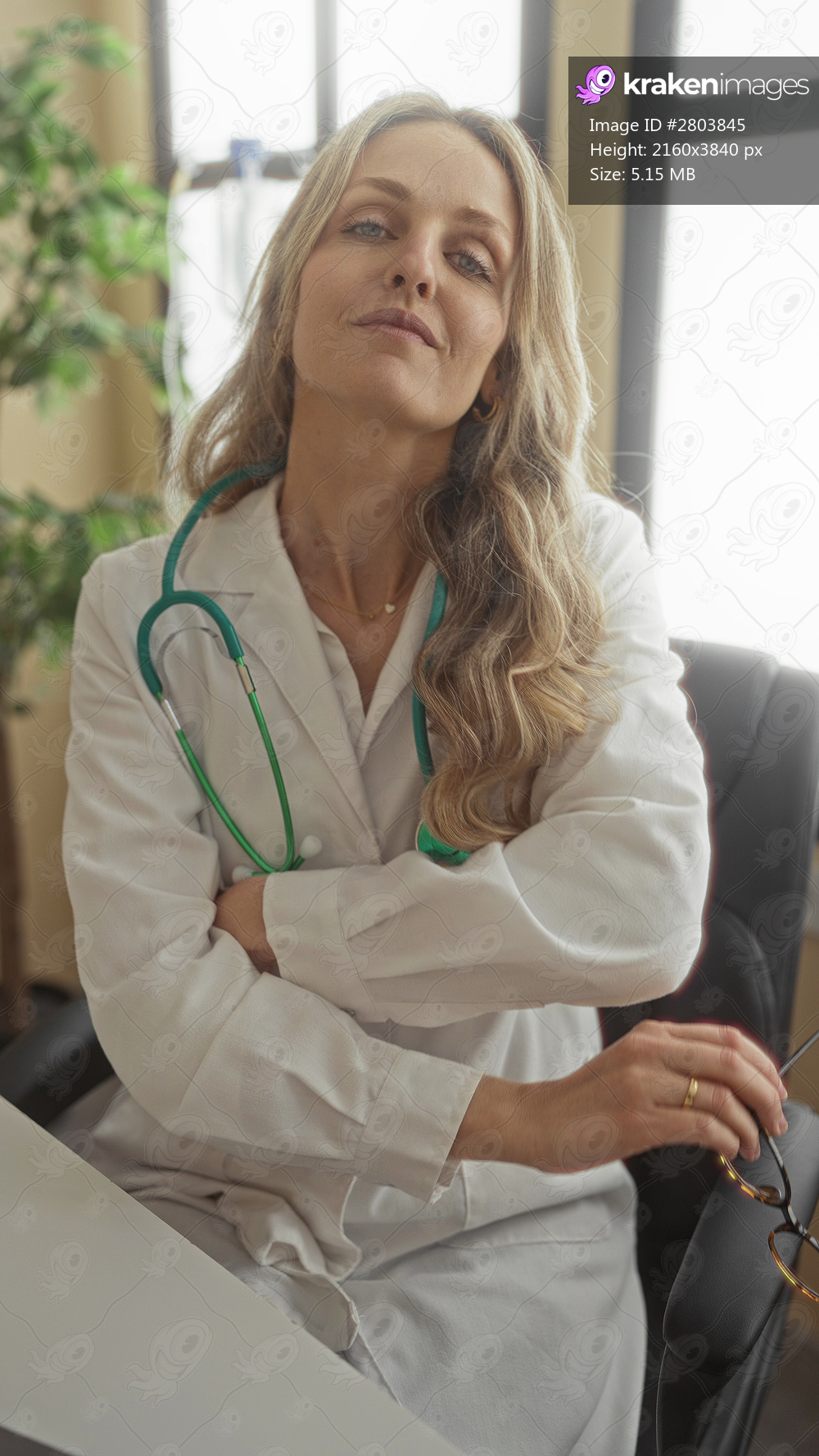 Woman doctor with stethoscope in clinic room wearing uniform with glasses portrays professional demeanor in hospital setting