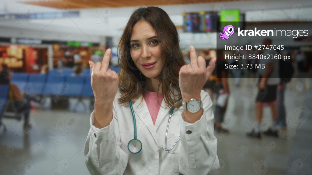Woman doctor with stethoscope making gesture in lively airport terminal portraying a surprising scene