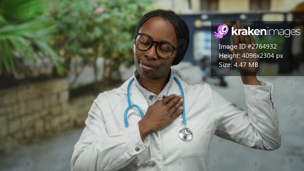 Woman doctor with stethoscope on urban street raises hand in oath gesture displaying commitment and confidence outdoors.