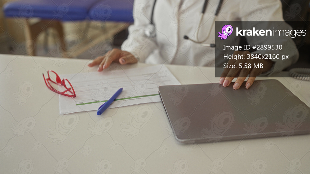 Woman doctor with stethoscope places hand on laptop on clinic desk, red glasses and pen nearby; compassionate care.