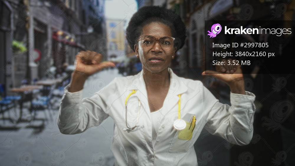 Woman doctor with stethoscope pointing both thumbs to her chest on a narrow street alley amid cafe tables and storefronts presenting herself; confidence public health. - Kraken Images