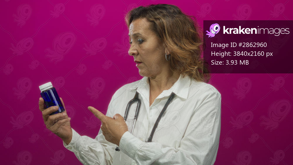 Woman doctor with stethoscope pointing finger to bottle in pink studio; concern health safety awareness.