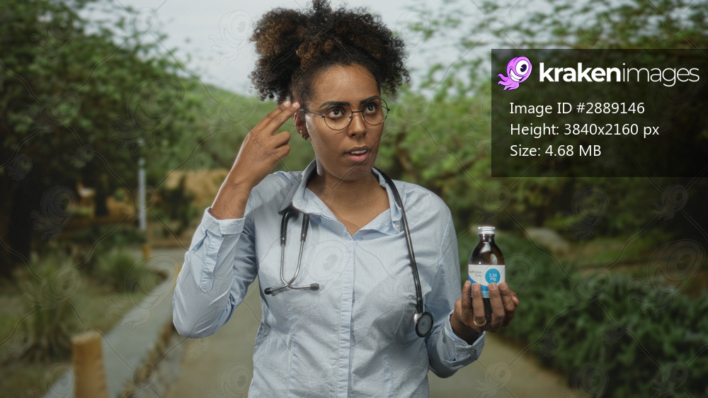 Woman doctor with stethoscope pointing to temple while holding medicine bottle in park; concern medical dilemma.