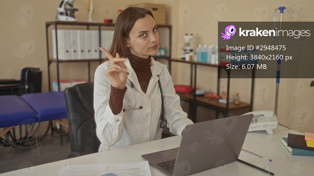 Woman doctor with stethoscope points finger to camera over laptop at clinic building desk, typing and reviewing records; calm reassurance.