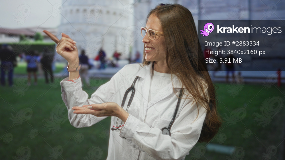 Woman doctor with stethoscope points finger to leaning tower at building in pisa, smiling and presenting with open palms; travel curiosity joy.