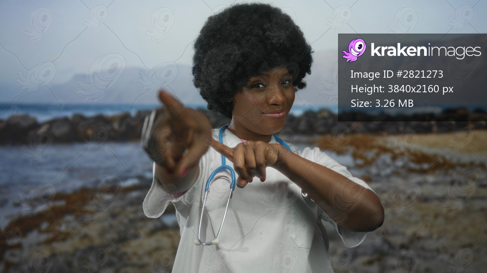 Woman doctor with stethoscope points finger toward camera at sunny sandy beach shore while smiling; joy.
